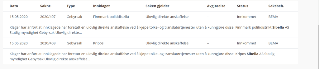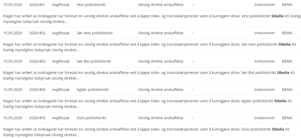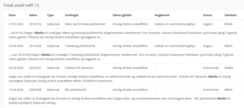 Men se om ikke hans handlinger underbygger opplysningen trass i protestene. Det må ha nemlig vært mye ledig tid og et dårlig år for både bedriftsrådgivning og brøyting i 2020 også, for i mai klaget Sibella AS Politiets IKT-tjenester inn for KOFA for ulovlig direkte anskaffelse av telefonsentraler og vedlikehold på telefonsentraler (!). En drøy uke senere klaget han politidistriktene Oslo, Øst, Vest, Sørvest, Sør-Øst, Agder, Nordland, Finnmark og Kripos inn for KOFA for «ulovlig direkte anskaffelse ved å kjøpe tolke- og translatørtjenester uten å kunngjøre disse». Tidligere har han innklaget Møre og Romsdal og Trøndelag politidistrikter for det samme. Han er nesten i mål, for da gjenstår bare Innlandet og Troms politidistrikter. Har han glemt dem, eller er de i kjømda?