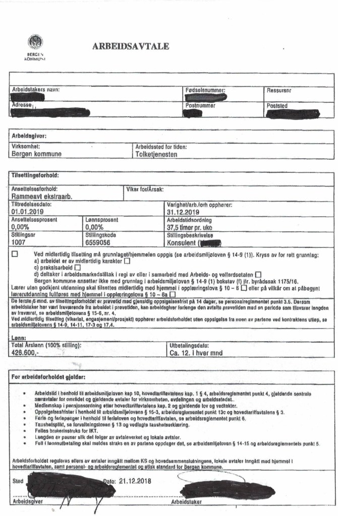 Da tolken engasjerte advokat, ble det endelig holdt forhandlingsmøter, men kommunen forsøkte å sensurere referatet fra møtet. Her det endelige referatet, med de sensurerte innvendingene fra tolken og advokaten og kommunens innrømmelse av at kontraktsforholdet ikke fylte lovens krav, som kommunen til slutt skrev under på: