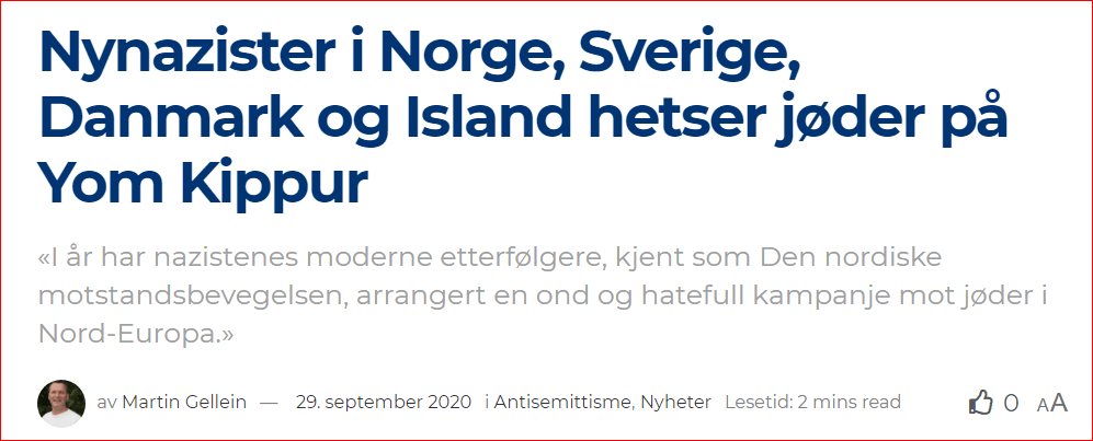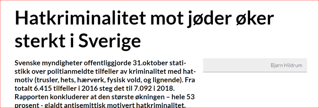 Sverige, folkhemmets vugge og lenge et fyrtårn av toleranse, fred og sosialdemokratisk velferd, opplever også økende aggresjon mot jøder som føler seg truet og hetset. Det samme gjelder Norge, jødiske barn tør ikke bruke kippa på skolen, og jøde er blitt et skjellsord på linje med hore og homse.